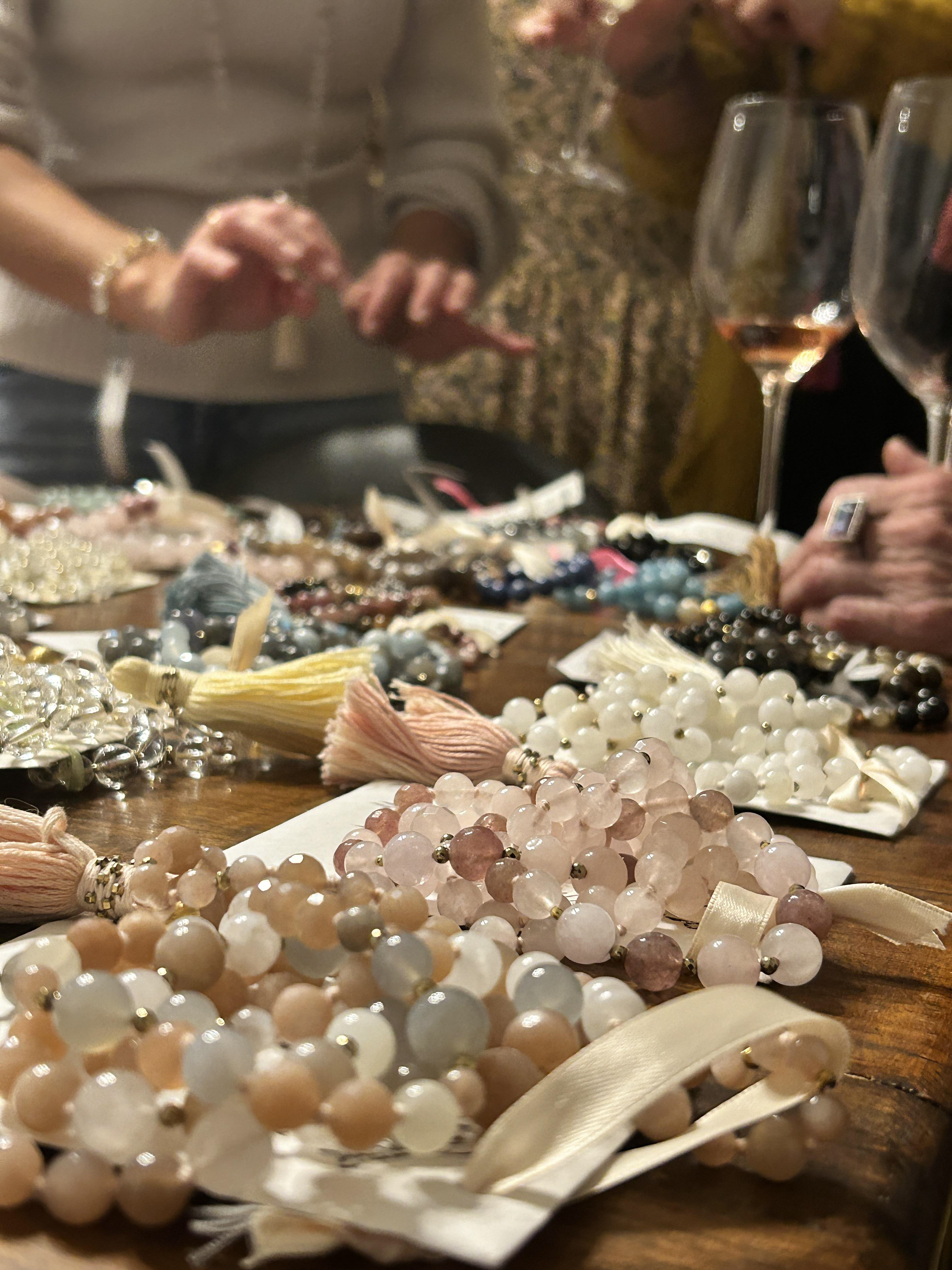 Bei einem Glas Champagner (oder einer alkoholfreien Alternative) und Snacks öffnen wir die Schatzkiste zu noch mehr Stein- und Öle-Magie: Bea hat ihre wunderschönen Schmuckstücke dabei – Malas, zarte Kristallketten, feine Anhänger, Armbänder … Du kannst alles in Ruhe anprobieren, reinfühlen, ausprobieren. Bea berät dich mit ihrem feinen Gespür, welche Steine dich aktuell am besten unterstützen könnten.